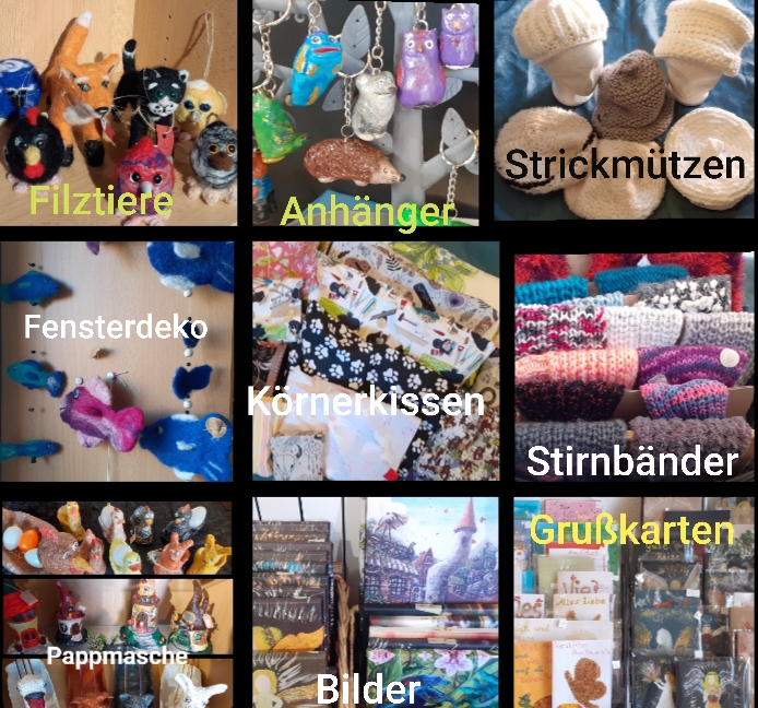 - Geburtstags oder Gruß -Karten, gemalt mit alten Kindheitshelden oder mit Bernstein oder mit lustigen Sprüchen - Magnete mit Sprüchen, - Mützen, Stirnbänder , - Baumwoll- Dreiecks-Tücher für groß und klein und -Haar-Schmuck sowie Ohrringe und Fensterdeko Figuren aus Filz, - lustige TAschen, - kleine und große Lavendelkissen/anhänger und Körnerkissen, - Schmuck aus Heilsteinen , für die passende Auswahl der Steine helfe ich gerne weiter ![]() ![]() ![]() ![]()